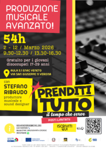 Note Digitali Avanzato – Laboratorio formativo sulla produzione musicale Quandodal 2 al 12 marzo 2026, dalle 9:30 alle 16:30 escluso weekend.Totale: 52h DovepressoENAC VenetoVia San Giuseppe 11, Verona Gratuito, età compresa tra 18-29 anni disoccupati… Leggi tutto: Note Digitali Avanzato