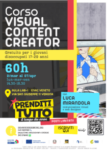 Laboratorio formativo: VISUAL CONTENT CREATOR Quando 2 marzo al 7 aprile 2026 il lunedì, mercoledì e venerdì, dalle 14:30 alle 18:3060 ore totali. DovepressoENAC – Via San Giuseppe, 11Verona (VR) Gratuito, possono partecipare le persone… Leggi tutto: Laboratorio formativo: VISUAL CONTENT CREATOR
