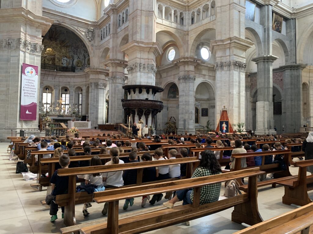 È stato uno dei momenti più emozionanti perché quella porta era stata aperta per noi in quell’orario e questa unicità ci ha fatti sentire speciali. Significativo anche il gioco di luci creato. all’entrata erano spente e poi, una volta entrati tutti i bambini, le luci sono state accese. Tutto questo ha contribuito a vedere questo passaggio il simbolo dell’ingresso in una nuova vita ricolma di bontà e fiducia, di gioia. Ogni bambino ha varcato quella soglia con attenzione e ordine, mantenendosi composto nella certezza che quel momento era veramente importante. Don Marco Labate, al quale è affidato il Progetto Pastorale del nostro Istituto scolastico, ha accolto i “piccoli pellegrini” con parole profonde, rese ancora più “importanti” dal luogo maestoso in cui ci si trovava, la chiesa più grande di Pavia. che qualcuno vedeva per la prima volta. Abbiamo pregato e cantato, incentrando l’attenzione sul tema della Speranza. La parabola del Figlio prodigo ha illuminato i cuori nella certezza dell’abbraccio sempre pronto di Gesù che ci attende anche quando sbagliamo. Abbiamo anche pregato per la Chiesa e ricordato Papa Francesco.