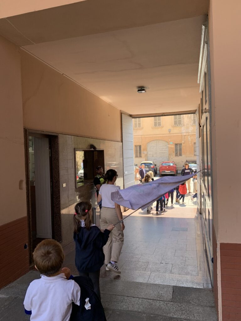 Con le bandiere del Giubileo, una per classe, che riportavano non solo il logo, ma il disegno della Porta Santa della Basilica di San Pietro, i bambini, accompagnati dai docenti, hanno attraversato le strade della città in pellegrinaggio giubilare, con passo sicuro e cuore aperto, dando forma visibile al significato del cammino. Questo pellegrinaggio non era solo uno spostamento fisico, ma il simbolo di un viaggio interiore verso l’amore di Gesù, un percorso di crescita e consapevolezza. All’arrivo al Duomo, il momento solenne ha preso vita e abbiamo attraversato la Porta Giubilare.