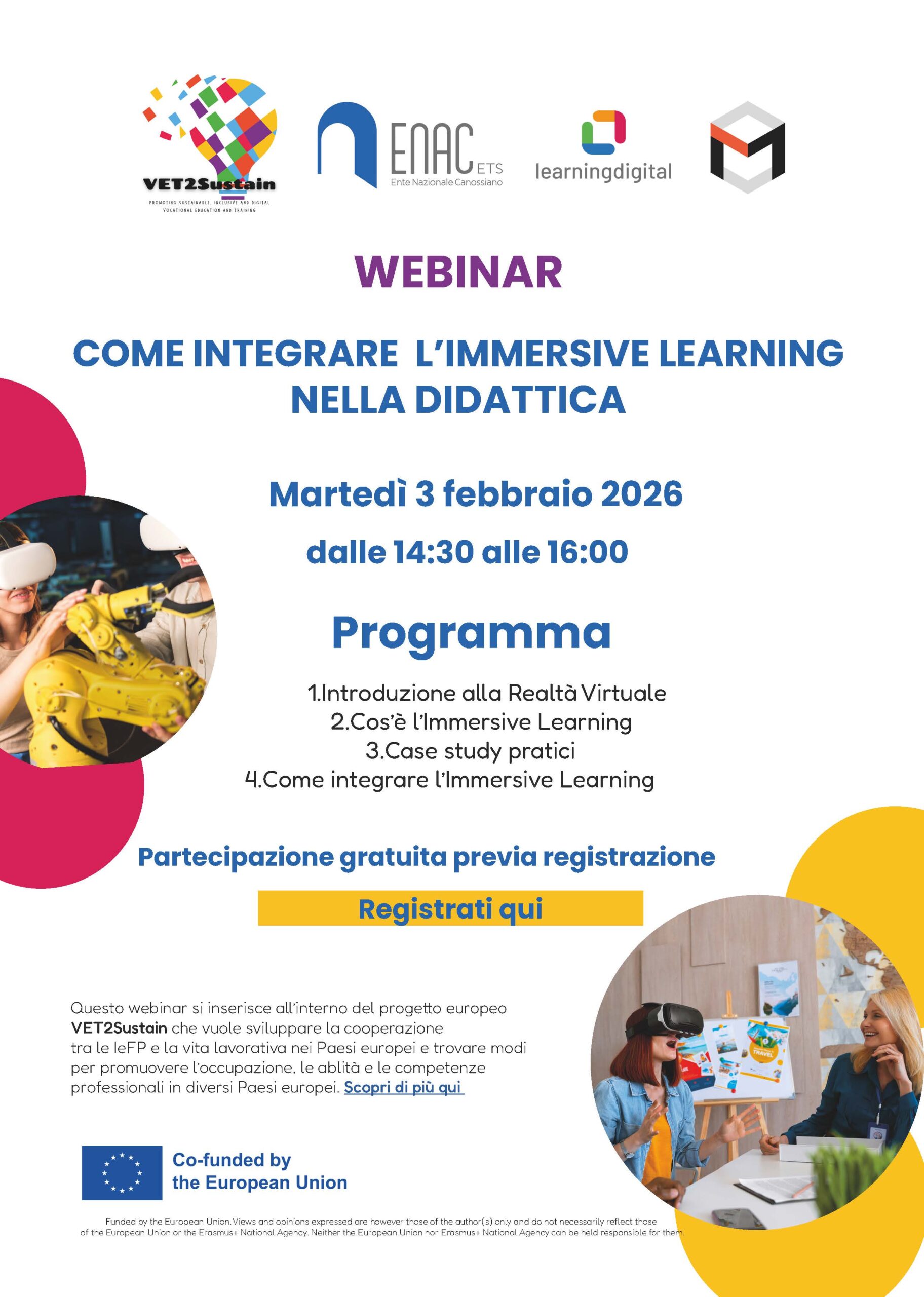 L’evento che si inserisce all’interno del progetto Vet2sustain nasce dalla collaborazione tra ENAC, Learning Digital e MIMBUS. Learning Digital, partner nel progetto Vet2sustain, è una società specializzata nello sviluppo di soluzioni di apprendimento in ambienti digitali, che si occupa di progettazione e erogazione di formazione online e blended learning. MIMBUS, invece, è leader dal 2011 nelle soluzioni di Realtà Virtuale dedicate ai lavori manuali e alla formazione professionale, con quasi 30 soluzioni formative in VR e Realtà Aumentata.